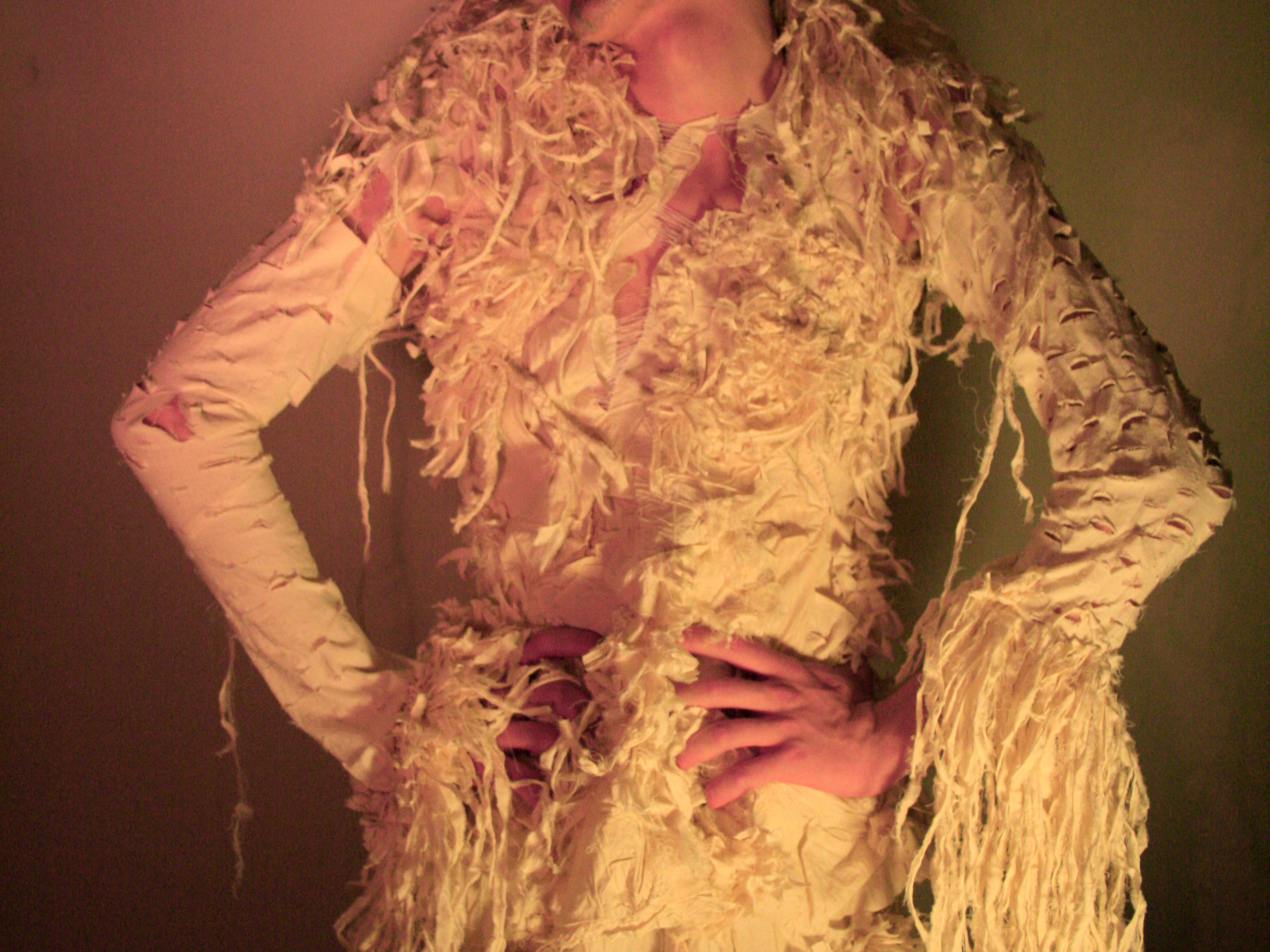 Embroidered with red and pink Czech glass beads, lined fully in satin with free standing satin bow and Edwardian style buttons on the back, "BITTERSWEETTOP" represents the tension between embracing one's body and rejecting it in the context of trans identity. References to highly gendered "formal wear" and shining chest embellishments serve this idea.